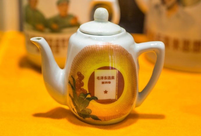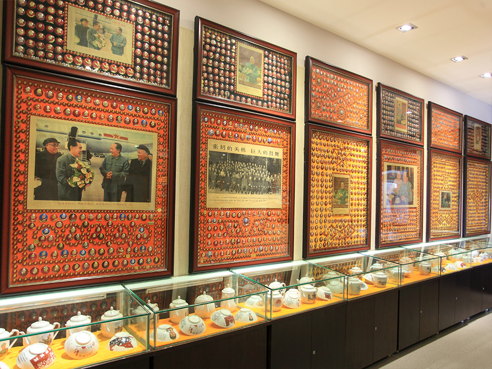 在毛泽东像章博物馆三楼漫步,你随时会在橱窗、橱柜或角落里邂逅一些带有时代印记的茶壶或瓷器。于国杰说,最初他只收藏像章,后来是一位老先生的举动感动了他,并为他打开瓷器收藏的大门。