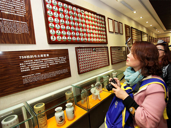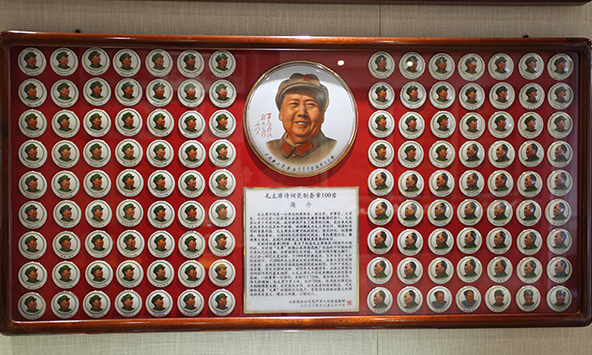 威海毛泽东像章博物馆收藏的一套毛泽东瓷质套章,共计758枚,是山东铝业像章办公室为纪念毛泽东诞辰100周年设计制作的。像章全部采用异形偏圆高频透明瓷,内外子母线三道金圈,每枚像章直径56毫米,象征全国56个民族和谐团结。本套瓷质章为样品,全国仅此一套。
